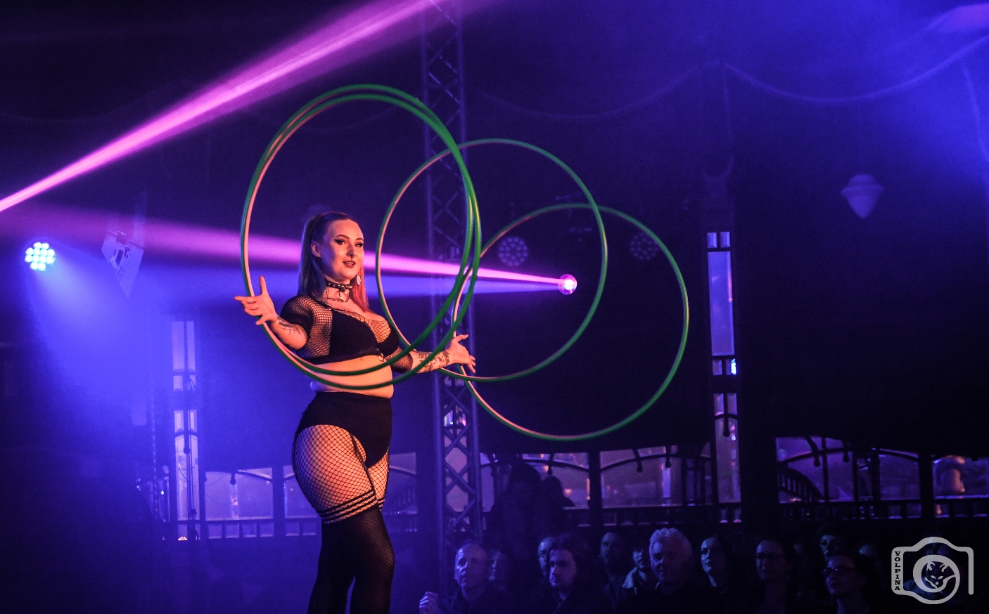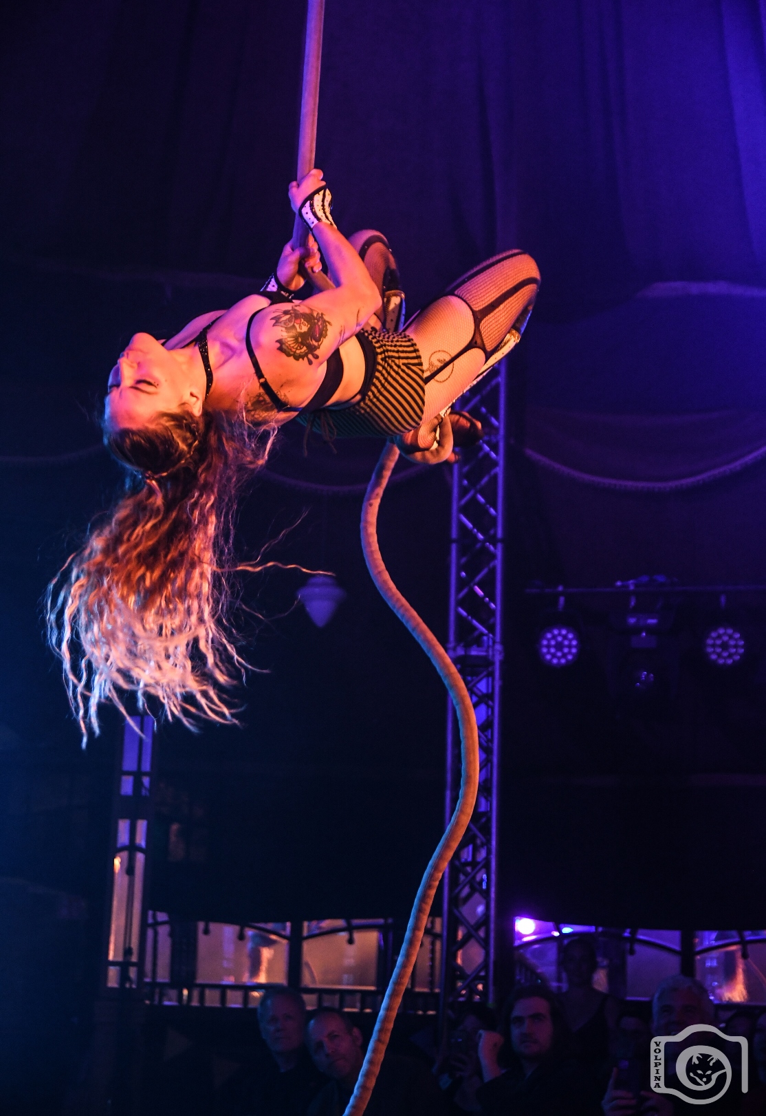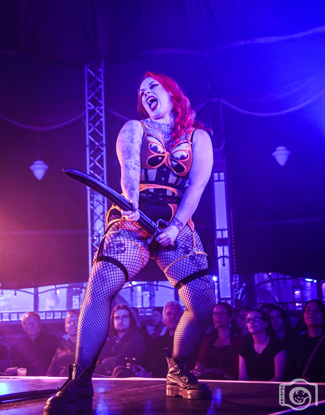 Frances Widow has gathered the fiercest, captivatingly bizarre, and beautifully odd misfits to bring you, alt.circus, sideshow cabaret, Widow’s Rock n Rollium.From the dive bar to the stage, these rockers shock and amaze! We were prepared to witness edge of our seat feats of danger, spectacular displays of strength, dances with pain, and acts of unapologetic, anarchic revelry. Hosted by the show’s namesake, Frances Widow, it featured acts from Eve Elle, Sin City Sideshow, Kali Viridis, and Kelsey Bell.